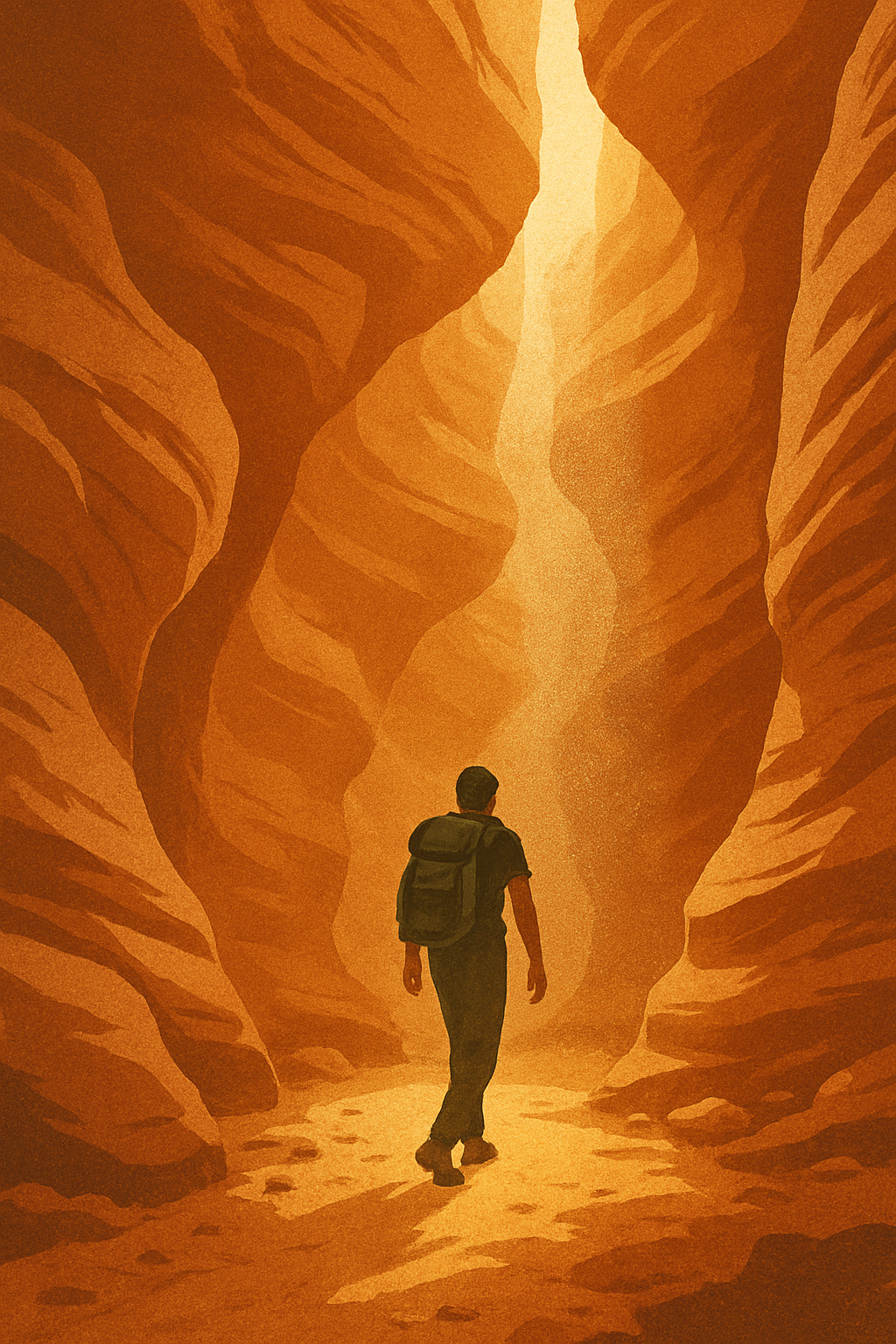The trail began in sunlight. Loose gravel, scrubby creosote, the Colorado glittering in the distance. We didn’t expect much. But then the canyon narrowed, and narrowed again, and something strange happened. The rock walls folded in around us like hands. Not heavy—gentle. But total. The world outside fell away. Inside the slot, everything was quiet and cool. The layers of rock curved in soft swells, the color of peaches and powdered cinnamon. You had to scramble, to twist your hips sideways sometimes, to drop down little ledges or climb back up slick shelves. There was a tension in the body, but a loosening in the mind.
