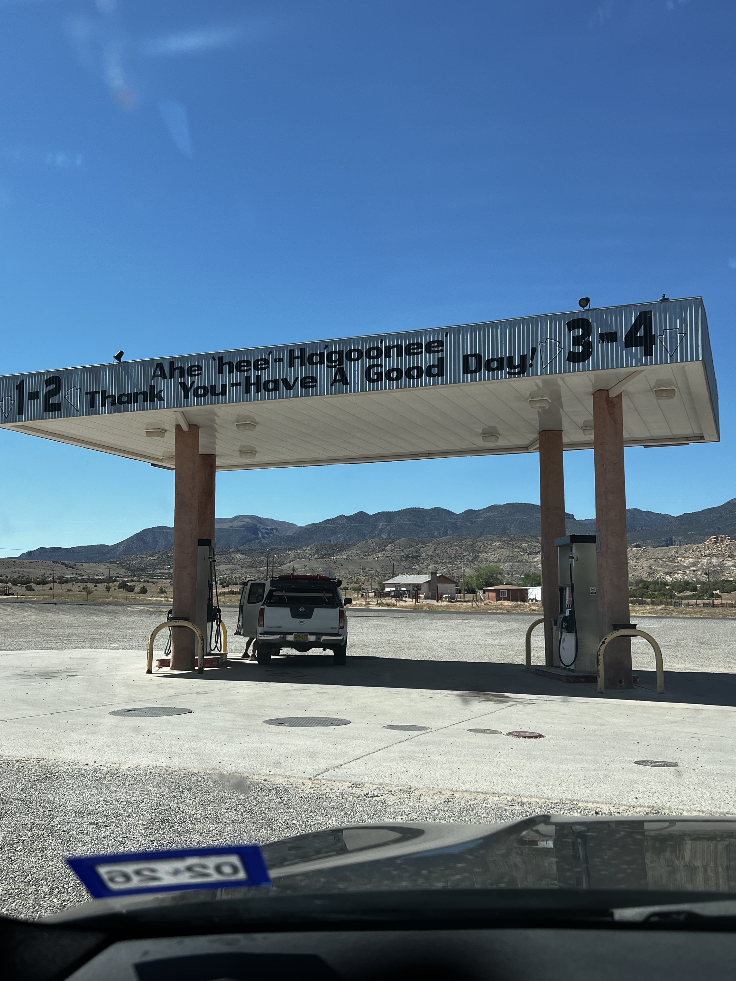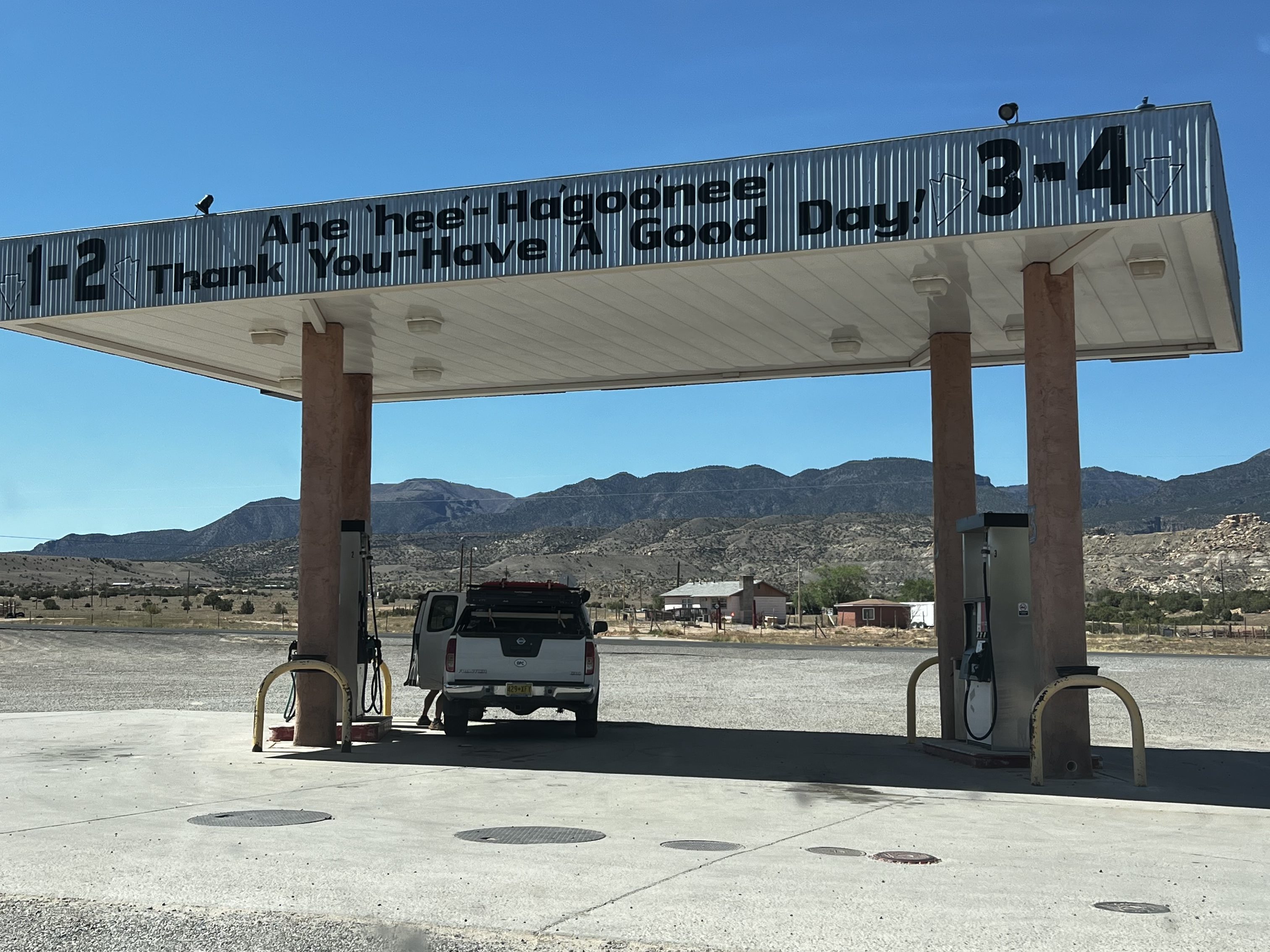 Not long after, I hit a stretch of road that very clearly wasn’t going to have another gas station for 100 miles, so I doubled back a half-mile to Teec Nos Pos to fill up. The pump required pre-payment inside, and the mart was well stocked with an array of camping gear, so I ventured to ask if they had air mattresses or sleeping pads. In response, the owner, Terry, who was Native American, asked me: