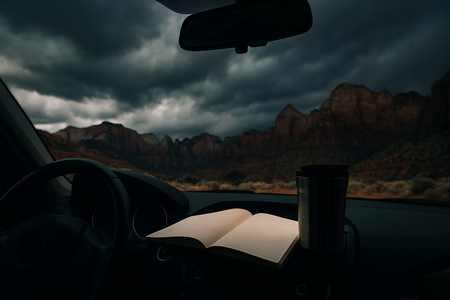 So, I didn’t. Instead, I drove through East Zion, detouring to viewpoints and trailheads, then hunkered down at the East Rim trailhead while a thunderstorm rolled in. Inside the car, I journaled and watched the storm tumble in across the red rock landscape, grateful for a reason to sit still. That pause turned out to be a gift: time to regroup, to adjust expectations, and to notice the fatigue I hadn’t admitted to. The trip had been beautiful, but it had also been nonstop. Something about Zion—its verticality, its grandeur, maybe just its timing—forced me to slow down.