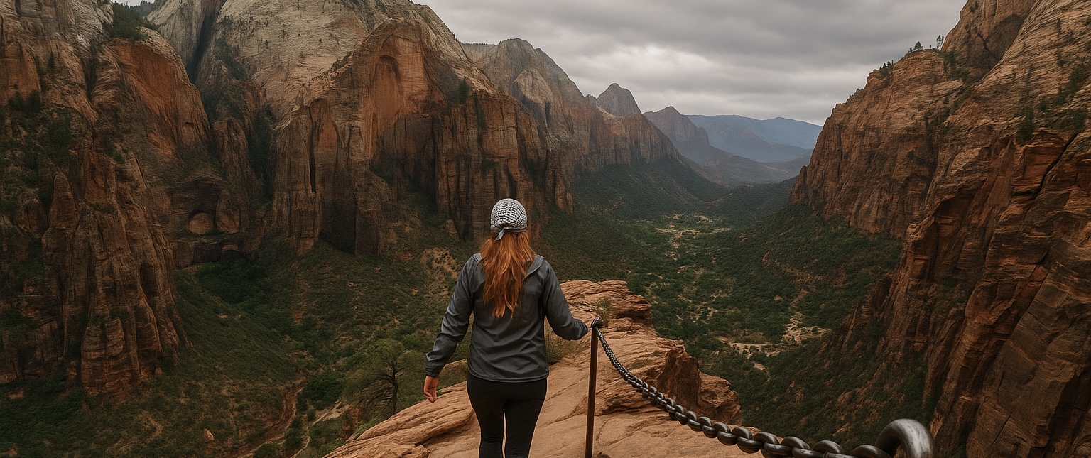The next morning, I stepped up to Zion again, this time ready—and with a last-minute Angels Landing permit in hand. I set out at 10 a.m. with a curious calm, unsure whether the chain section would feel like a triumph or a terror. I’d seen the photos, of course. Everyone has. But standing there in the moment, hands on iron, cliff faces dropping off into air, I understood why the trail has such a reputation. I’m not scared of heights, I thought—until I was. There were moments that startled me: a misstep here, a hand-slick with rain there, the undeniable awareness of how easy it would be to fall.