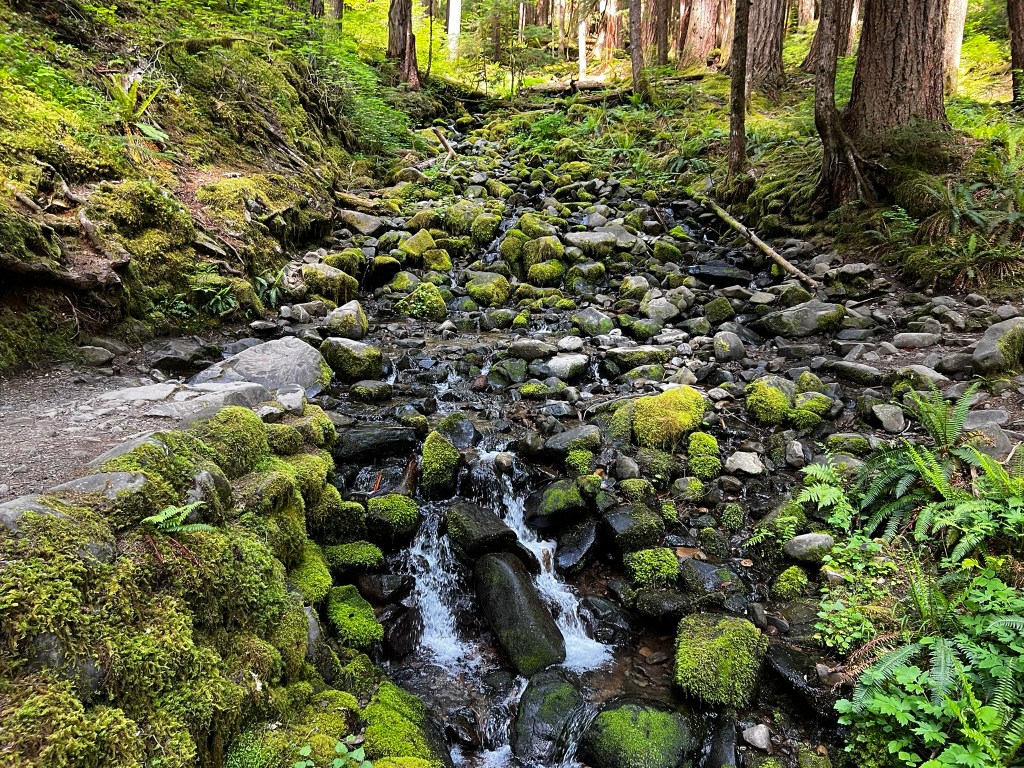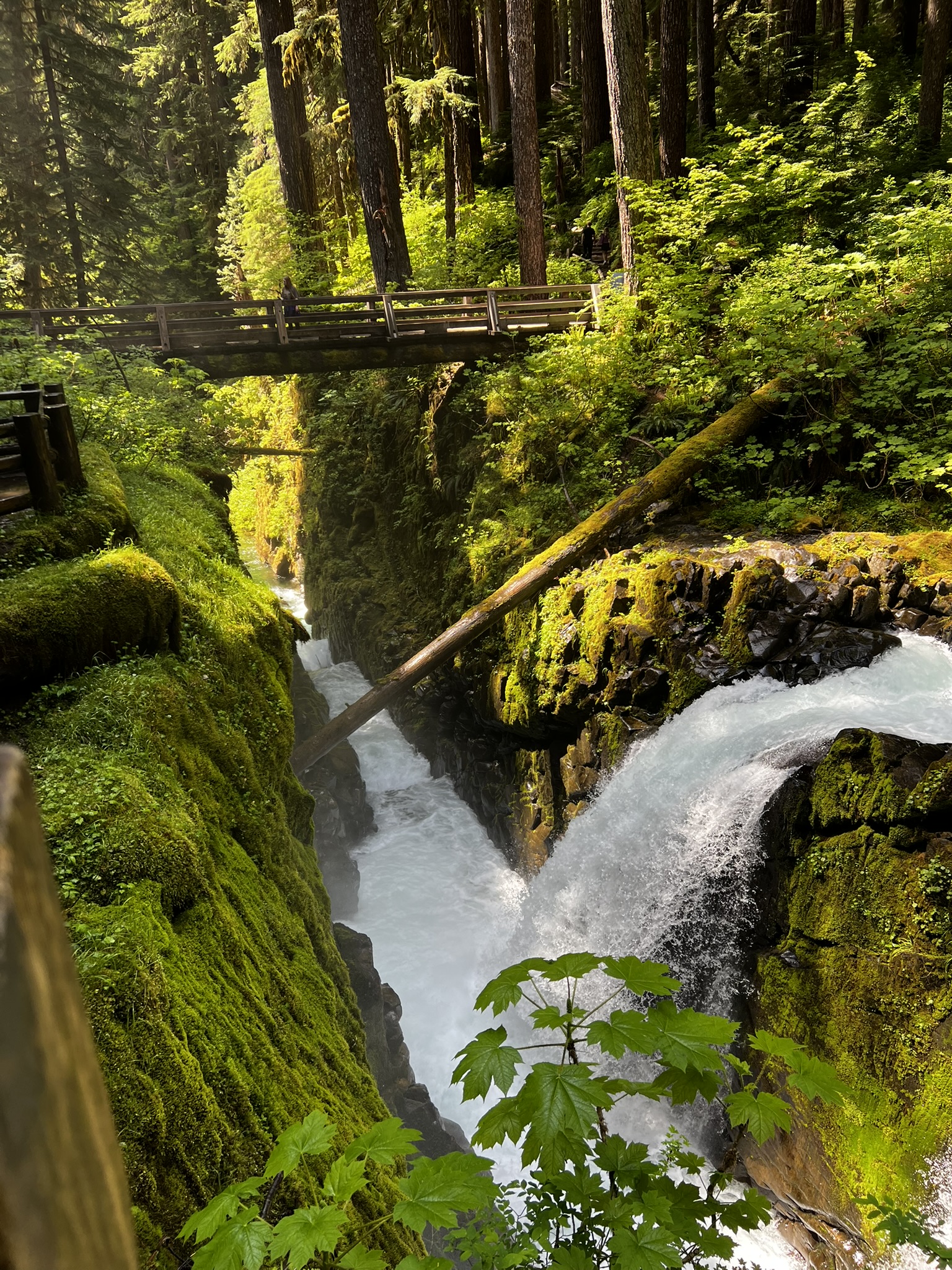 My first hike was to Sol Duc Falls, and it immediately established a stark contrast against the arid red deserts that had defined the last leg of the trip. Indeed, my choice of audiobook (Dune by Frank Herbert) would have suited that leg much better, though it did serve to underscore the beauty of Olympic National Park in a new dimension. In the car, I was immersed in a tale of constant preoccupation with finding water on a desert planet, and in the natives’ incredulity at the idea of a world where water falls from the sky and pools in great lakes and oceans, rather than having to be plucked from the air by specialized machinery and swept up as dew in great nets. Then I would hop out, lace up my hiking boots and stroll through a hushed, magical world where the presence of water invaded all five senses: beading on the tips of ferns, dripping rhythmically onto thick leaves, gurgling over brooks and crashing into ravines. Life sprang at me from every corner: lush green ferns, towering trees crawling with mosses, and layer upon layer of birdsong.