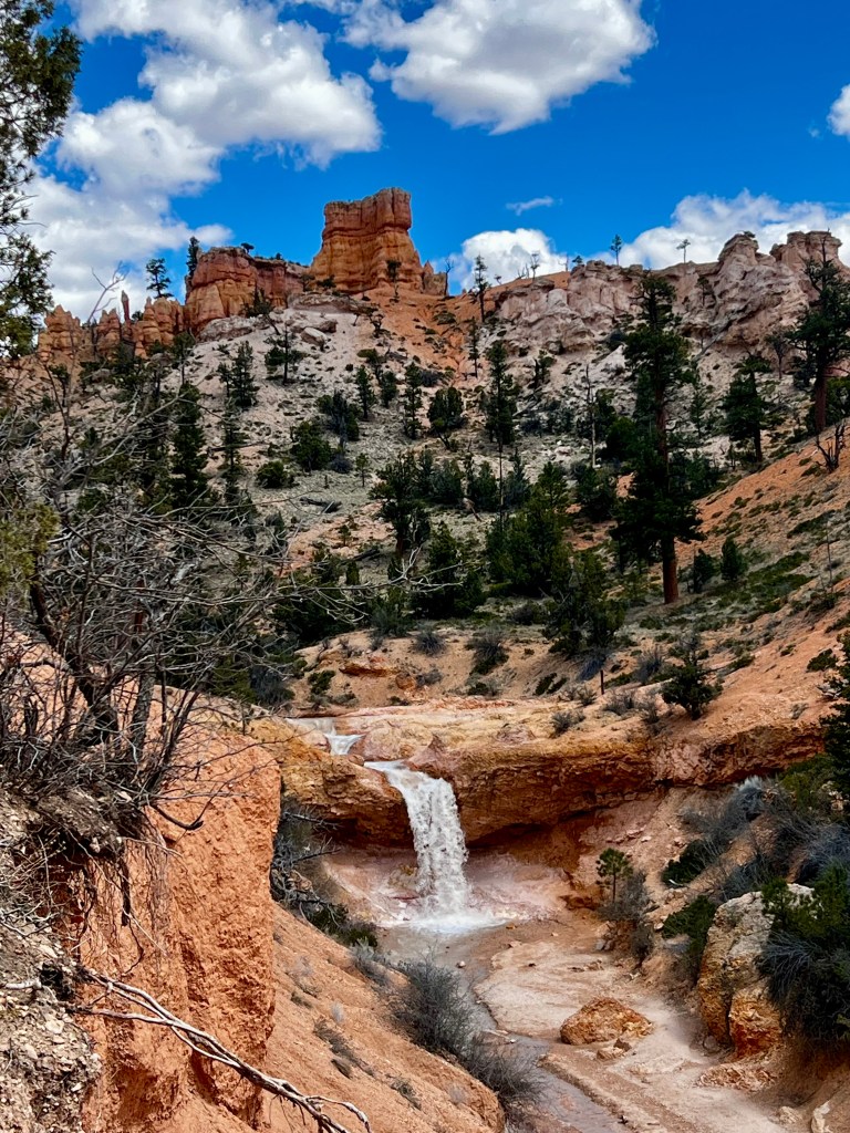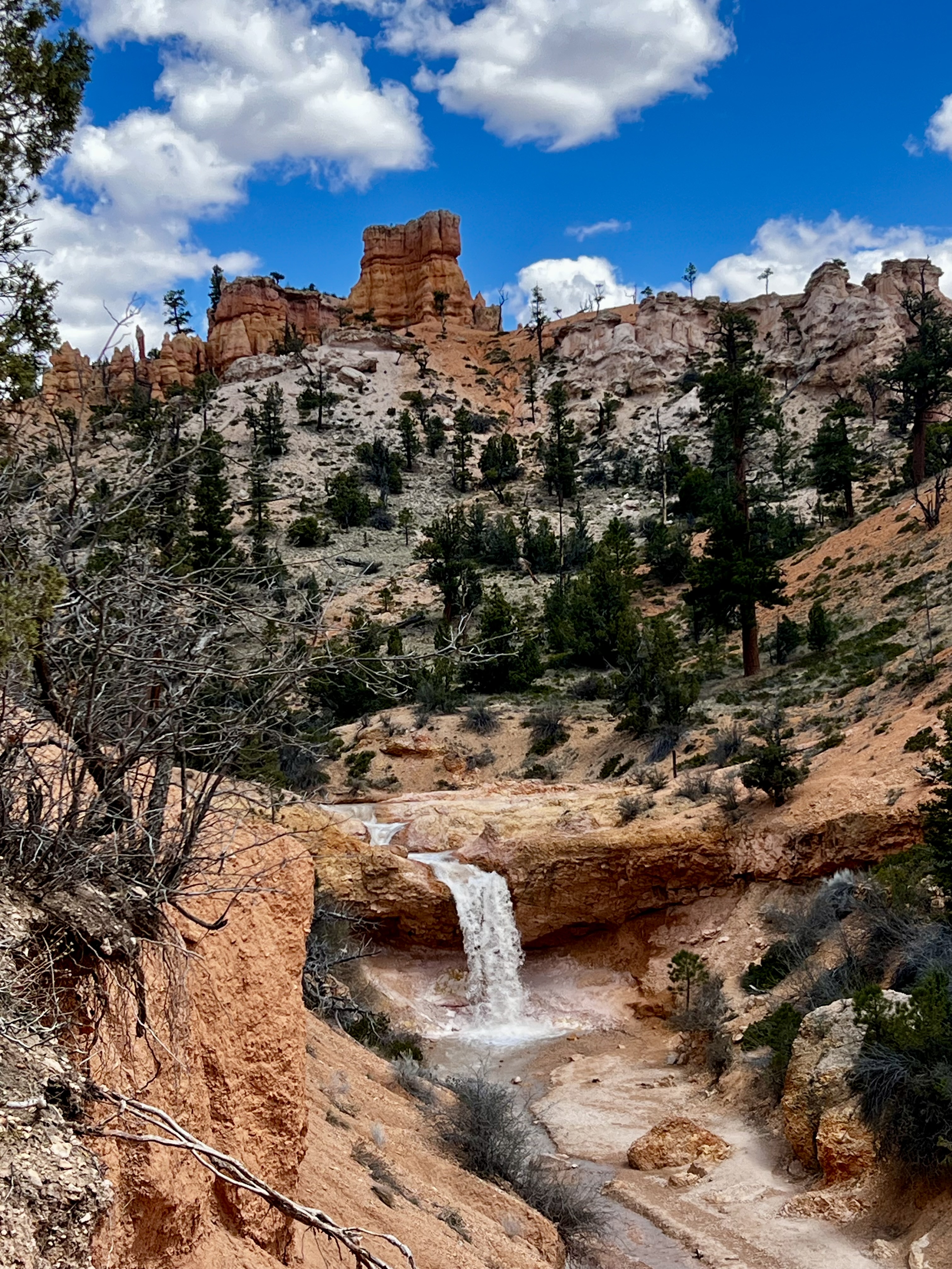 My second day in Bryce Canyon was the opposite of the first. Instead of starting out with high hopes and gradually dialing them back, this time I fully anticipated taking it easy again and trading in the ambitious Fairyland Loop Trail for the short and easy Mossy Cave Loop, another “non-Bryce-esque” with no hoodoos but lots of vignettes to enjoy. But this time, I found that resting up the prior day (and an egg salad sandwich for lunch after the easy Mossy Cave Trail) had restored me and I had energy to spare. Though starting the steep, 11-mile Fairyland Loop at the peak 1pm heat was out of the question, I decided to hike an out-and-back section of it, and turned to my trusty copilot to tell me where to start and which direction to go to get the most bang for my buck. I ended up logging 2.5 more miles and 550ft elevation gain, and this was the first hike that actually took me among the hoodoos themselves, so it rounded out the visit very nicely!