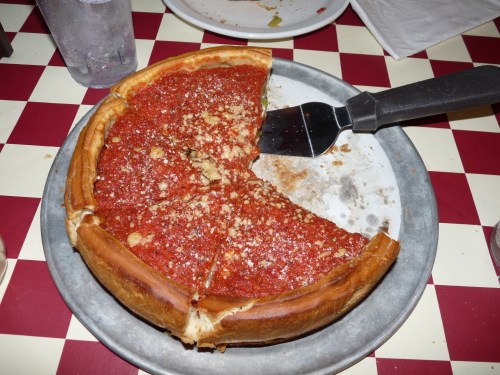 In Chicago, pizza is upside-down. They put the toppings on the bottom, then cheese on top and then the pizza sauce. It works! Giuliano’s pizza was awesome, and very, very filling. We ordered the smallest stuffed pizza they had, which was supposed to serve 1-2 people – but I don’t believe that even America’s most unusually-proportioned individual could have managed a whole one. Grant and I barely managed two thirds of it between us – and we were HUNGY.