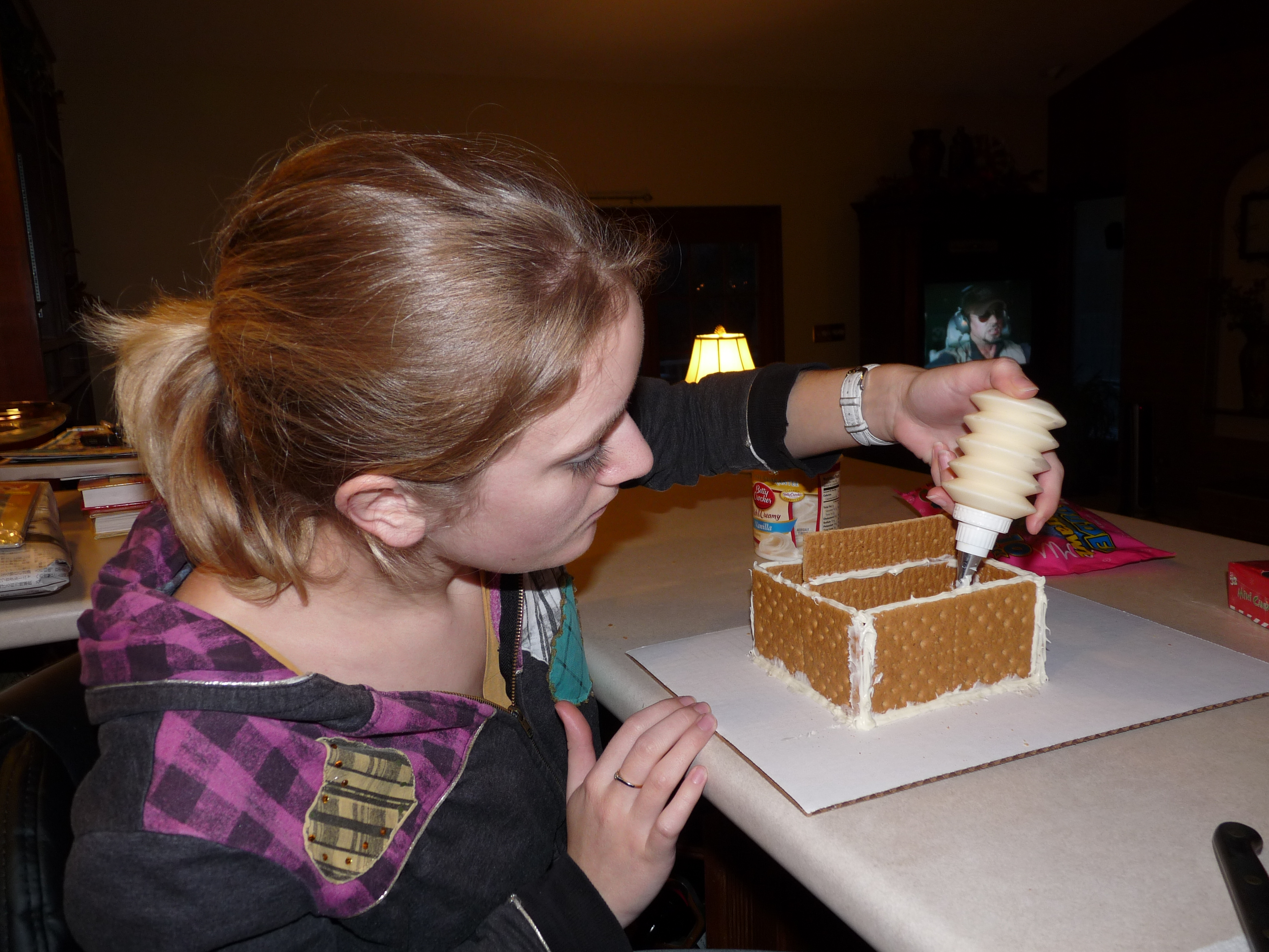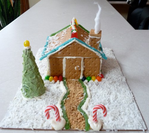 Watching Blake’s game and then getting Mexican on Little Christmas Eve was a very chilled-out and, in its own way, festive, lead-up to the holiday celebrations. On actual Christmas Eve we headed out to get a few last-minute things, such as rammikins for serving the coconut shrimp Mr. Stubbins was serving that evening for Grant’s grandfather coming to dinner. We also picked up some icing and some brightly-coloured candy from the dollar store, for the gingerbread house Grant and I constructed and decorated that evening. I had seen pictures of the gingerbread Grant had made with his flatmate a year or so ago, and got jealous. I like making things with Grant. He’s fun that way. And after our raging success with our cannibalistic pumpkin in October, we got a little ambitious once more and spent the evening holding pieces of crackerbread together in a cottage-esque shape, and covering it with approximately half of the sweet treats we had bought for that very purpose (I’ll let you come to your own conclusions as to the fate of the other half).