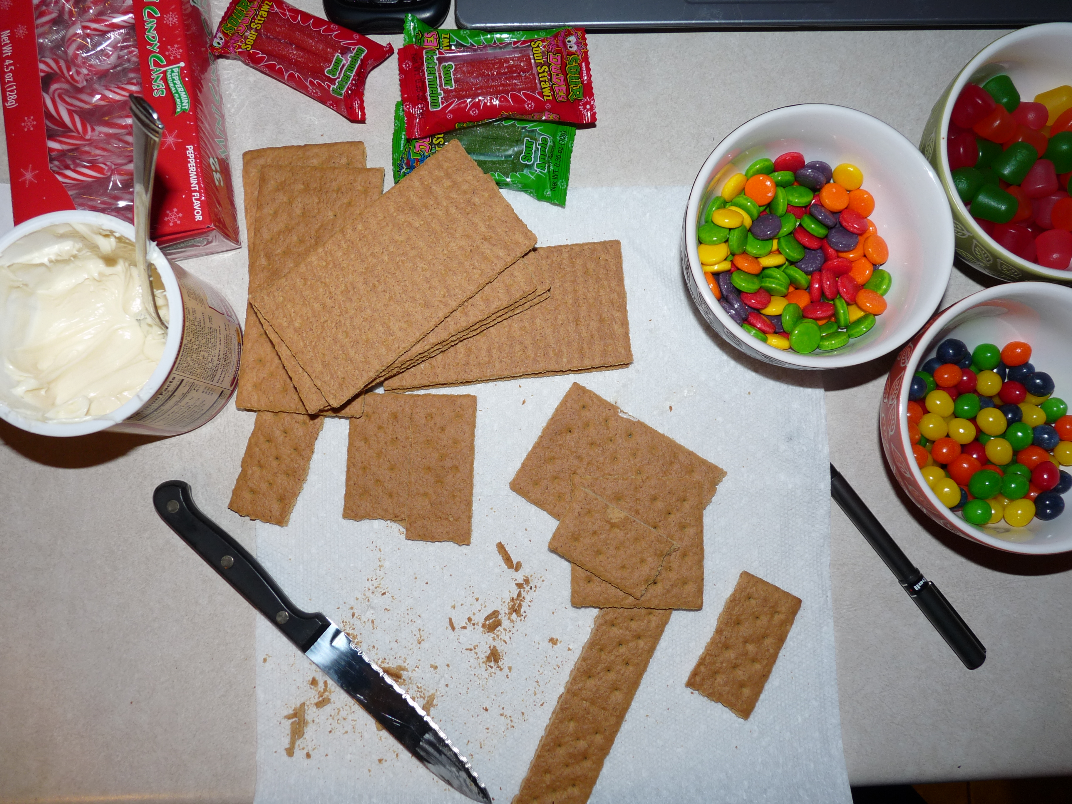 Blake was fascinated by the whole purpose, and commandeered the remaining scrap pieces of crackerbread and icing for his own structure he intended to make, but with the very specific shapes we happened to have left over, there really wasn’t much for him to make out of it.
